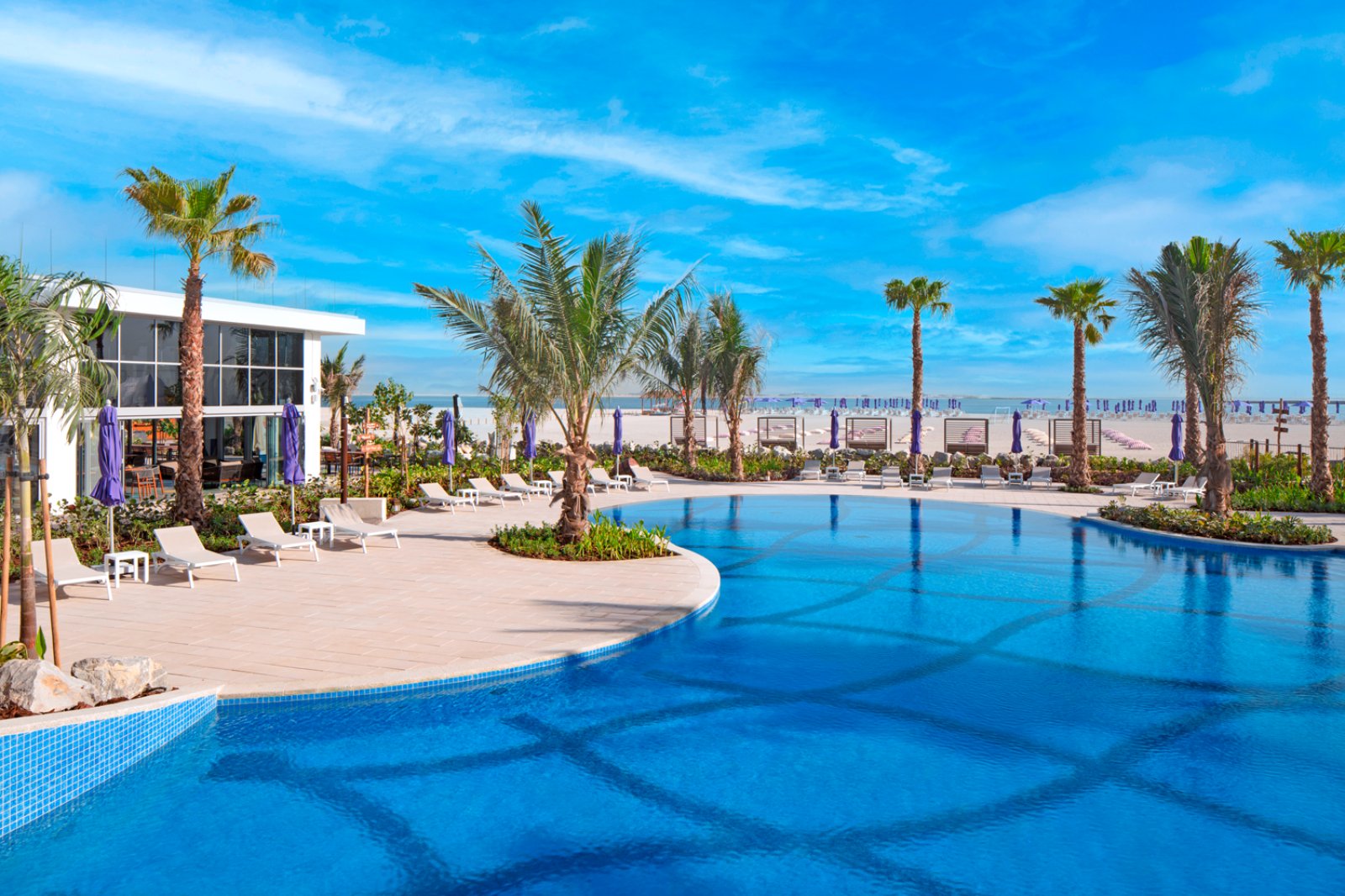 ► Meraviglioso punto mare con ampia spiaggia di sabbia bianca, sul lungomare delle isole di Dubai, di fronte a Deira